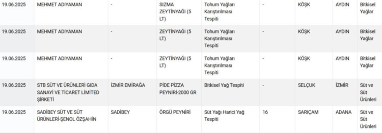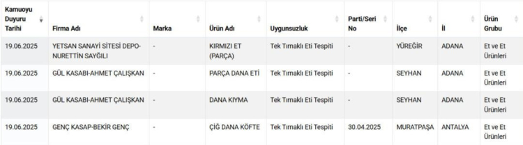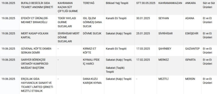 19 Haziran 2025 tarihli listede, Adana ve Antalya’da vatandaşlara dana eti yerine at ve eşek eti yedirildiği bilgisi yer aldı. Antalya Muratpaşa’da “Genç Kasap”, Adana Seyhan’da “Gül Kasap” ve Adana Yüreğir’de “Yetsan Sanayi Sitesi Depo” adlı işletmelerin ürünlerinde bu yasaklı etlere rastlandı.