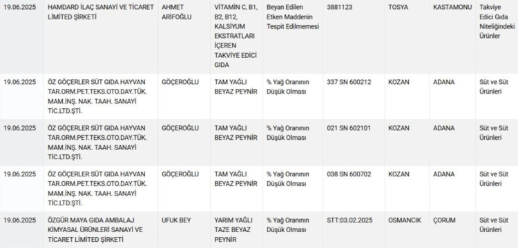 Güncellenen taklit ve tağşiş listesi, peynir, tereyağı, sucuk, köfte, kıyma, zeytinyağı, pekmez ve kırmızı et ürünlerinde tespit edilen sahteciliği detaylı şekilde içeriyor. Detaylı listeyi ve ifşa edilen firma