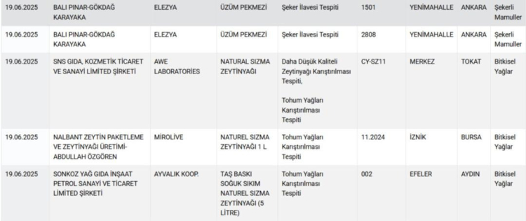 Listede ayrıca üzüm pekmezine şeker ilavesi, zeytinyağına tohum yağı karıştırılması, tereyağına bitkisel yağ eklenmesi, sucukta kanatlı eti ve kalp kullanılması, köfte ve kıymaya tavuk eti ve kalp gibi sağlığa zararlı karışımların yapıldığı belirlendi.