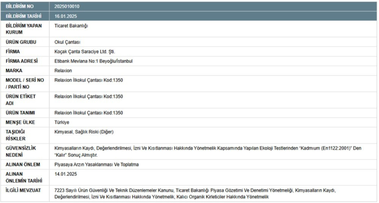 Ticaret Bakanlığı, Güvensiz Ürün Bilgi Sistemi’ne (GÜBİS) bu kez bir okul çantası için uyarı notu ekledi. Söz konusu okul çantasının, kimyasal açıdan sağlık riski barındırdığı bildirildi. Bakanlık, çantanın piyasaya arzını yasaklarken, mevcut ürünlerin de toplatılmasına karar verdi.