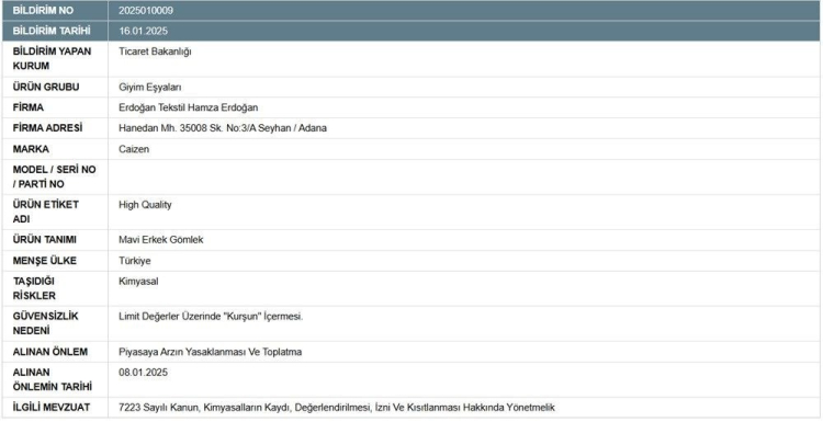Mavi renkte olduğu görülen söz konusu gömleğin izin verilen limit değerler üzerinde kurşun bulundurduğu belirlenmişti.