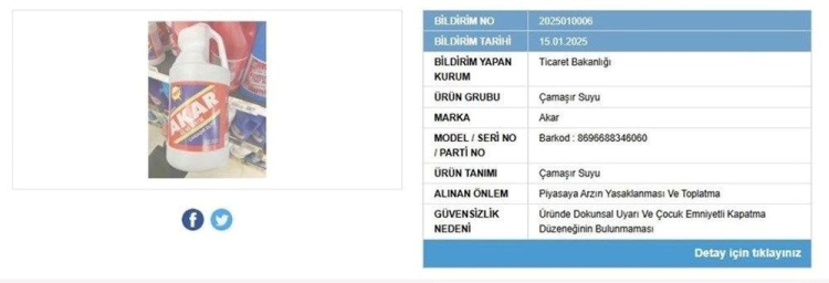 “Akar” marka ürünün dokunsal uyarı ve çocuk emniyet kilidinin bulunmaması nedeniyle riskli olduğu bildirilmişti. Çamaşır suyunun piyasadan toplatılmasına karar verildi. Ayrıca ürünün piyasaya arzı da yasaklandı.