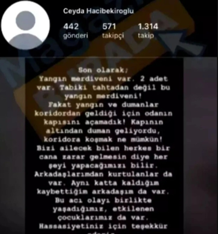 "Son olarak; Yangın merdiveni var. 2 adet var. Tabi ki tahtadan değil bu yangın merdiveni! Fakat yangın ve dumanlar koridordan geldiği için odanın kapısını açamadık! Kapının altından duman geliyordu, koridora koşmak ne mümkün! Bizi ailecek bilen herkes bir cana zarar gelmesin diye her şeyi yapacağımızı bilir. Arkadaşlarımdan kurtulanlar da var. Aynı katta kaldığım kaybettiğim arkadaşım da var. Bu acı olayı birlikte yaşadığımız, etkilenen çocuklarımız da var. Hassasiyetiniz için teşekkür ederiz. Başımız sağ olsun."