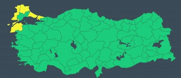 Meteoroloji Genel Müdürlüğü'nün yayımladığı haritada 4 kent sarı kodla uyarıldı.Buna göre Çanakkale, Edirne, İstanbul ve Kırklareli'nde kuvvetli rüzgar bekleniyor. Yetkililer, muhtemel çatı uçması, ağaç ve direk devrilmesi, soba ve baca gazı kaynaklı zehirlenme riski ve ulaşımda aksamalar gibi olumsuzluklara karşı dikkatli ve tedbirli olunması gerektiği konusunda uyardı.