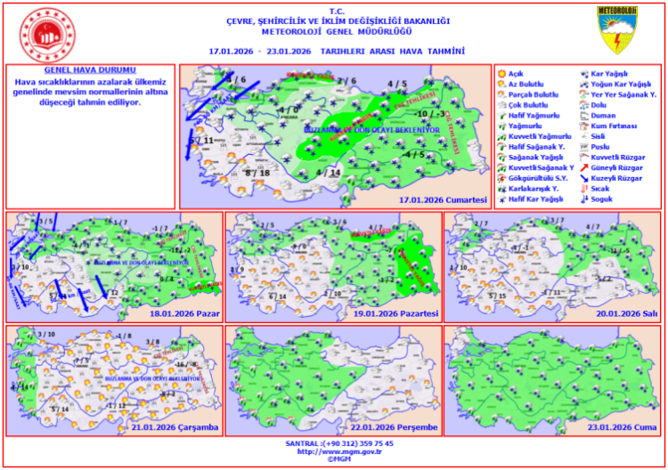 Meteoroloji Genel Müdürlüğü tarafından yapılan son tahminlerden derlenen bilgilere göre, hava sıcaklıklarının iç ve batı kesimlerde 4 ila 6 derece azalacağı tahmin edilirken; Marmara, Karadeniz, İç Anadolu Doğu Anadolu ve Güneydoğu Anadolu bölgelerinde karla karışık yağmur ve kar yağışının etkili olacağı öngörülüyor.