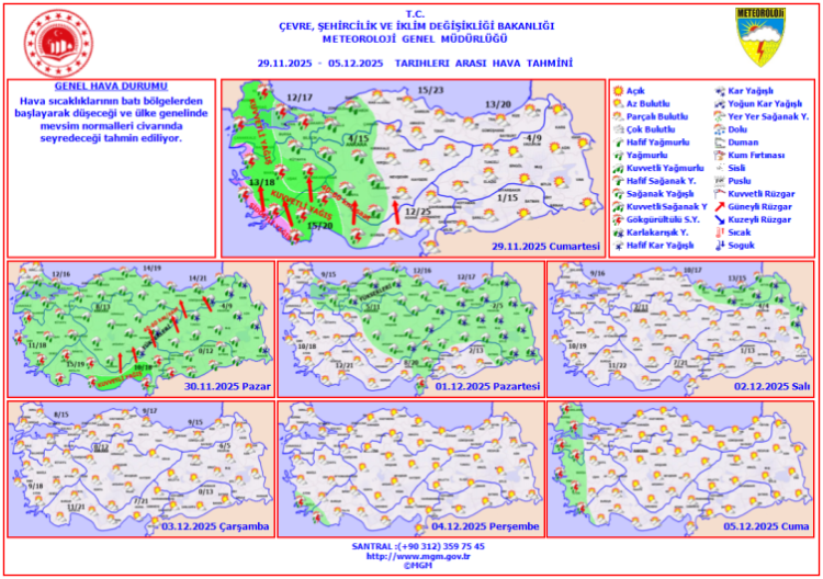 Hafta sonu yurt genelinde yağışlı hava etkili olacak. Sıcaklıkların batı bölgelerden başlayarak düşeceği ve ülke genelinde mevsim normalleri civarında seyredeceği tahmin ediliyor.