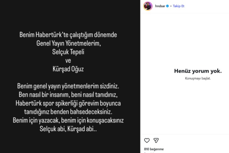 Hande Sarıoğlu devamındaki paylaşımda ise "Benim Habertürk’te çalıştığım dönemde Genel Yayın Yönetmelerim, Selçuk Tepeli ve Kürşad Oğuz. Benim genel yayın yönetmenlerim sizdiniz. Ben nasıl bir insanım, beni nasıl tanıdınız, Habertürk spor spikerliği görevim boyunca tanıdığınız benden bahsedeceksiniz. Benim için yazacak, benim için konuşacaksınız Selçuk abi, Kürşad abi.." dedi.