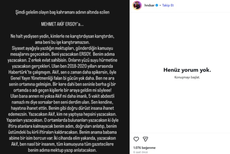 Mehmet Akif Ersoy'a sert ifadeler kullanan spiker "Ne halt yediysen yedin, kimlerle ne karıştırdıysan karıştırdın, ama beni bu işe karıştıramazsın. Siyaset ayağıyla yazdığın mektupları, gönderdiğin kamuoyu mesajlarını geçeceksin. Beni yazacaksın ERSOY. Benim adıma yazacaksın. 2 erkek evlat sahibisin. Onların yüzü suyu hürmetine yazacaksın gerçekleri. Ulan ben 2018-2020 yılları arasında Habertürk’te çalışmışım. Akif, sen o zaman daha spikersin, öyle Genel Yayın Yönetmenliği falan bi gücün yok daha. Ben ne ara senin ortamına gelmişim" dedi.