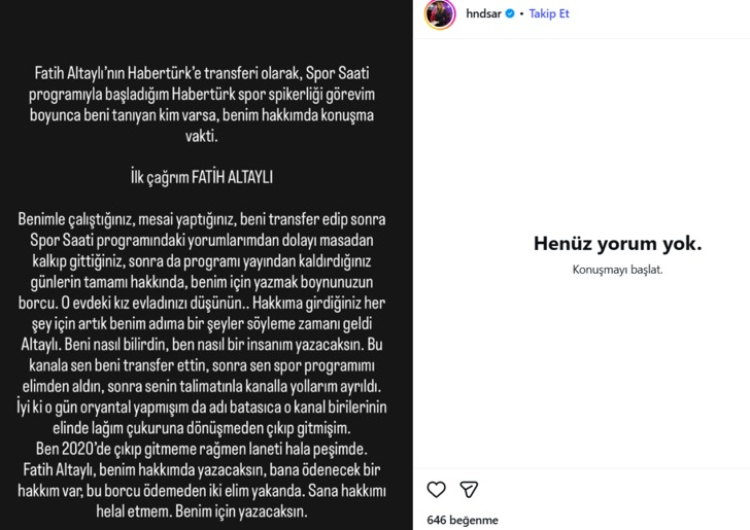 "Benimle çalıştığınız, mesai yaptığınız, beni transfer edip sonra Spor Saati programındaki yorumlarımdan dolayı masadan kalkıp gittiğiniz, sonra da programı yayından kaldırdığınız günlerin tamamı hakkında, benim için yazmak boynunuzun borcu. O evdeki kız evladınızı düşünün. Hakkıma girdiğiniz her şey için artık benim adıma bir şeyler söyleme zamanı geldi Altaylı. Beni nasıl bilirdin, ben nasıl bir insanım yazacaksın. Bu kanala sen beni transfer ettin, sonra sen spor programımı elimden aldın, sonra senin talimatınla kanalla yollarım ayrıldı."