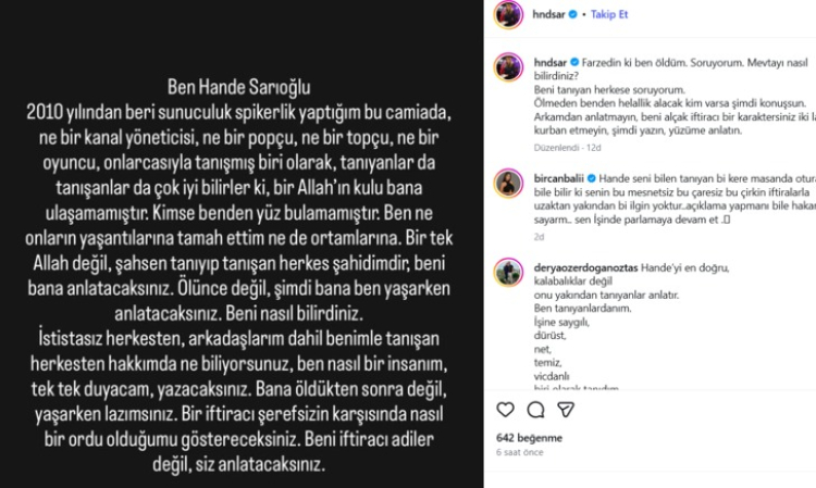 Hande Sarıoğlu paylaşımına "İstisnasız herkesten, arkadaşlarım dahil benimle tanışan herkesten hakkımda ne biliyorsunuz, ben nasıl bir insanım, tek tek duyacağım, yazacaksınız. Bana öldükten sonra değil, yaşarken lazımsınız. Bir iftiracı şerefsizin karşısında nasıl bir ordu olduğumu göstereceksiniz. Beni iftiracı adiler değil, siz anlatacaksınız" diyerek başladı.