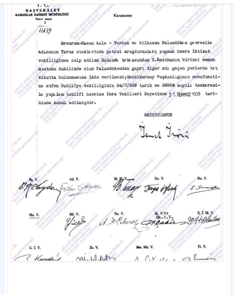 Araştırmacı Taner Özdemir,Cumhuriyet tarihinin dikkat çekici belgelerinden biri daha gün yüzüne çıkardı. 31 Temmuz 1939 tarihli resmî kararnamede, Hollanda tebaasından Y. Roothaan adlı girişimciye, Erzurum-Hasankale (Pasinler)-Tercan hattı ile Adana’nın Toros eteklerini kapsayan bölgede petrol arama izni verildiği görülüyor. Söz konusu belgeye göre, özellikle Palandöken çevresi başta olmak üzere belirlenen sahalarda petrol araştırması yapılmasına devlet tarafından resmî izin sağlandı. Kararın, dönemin Bakanlar Kurulu niteliğindeki İcra Vekilleri Heyeti tarafından alındığı ve ilgili kurumların görüşleri doğrultusunda şekillendirildiği anlaşılıyor. Belgede, sürecin yalnızca ekonomik değil aynı zamanda stratejik bir çerçevede ele alındığı dikkat çekiyor. Genelkurmay Başkanlığı’nın muvafakati ve Dahiliye Vekâleti’nin teklifiyle yürütülen izin süreci, petrol aramalarının güvenlik boyutunun da göz önünde bulundurulduğunu ortaya koyuyor.