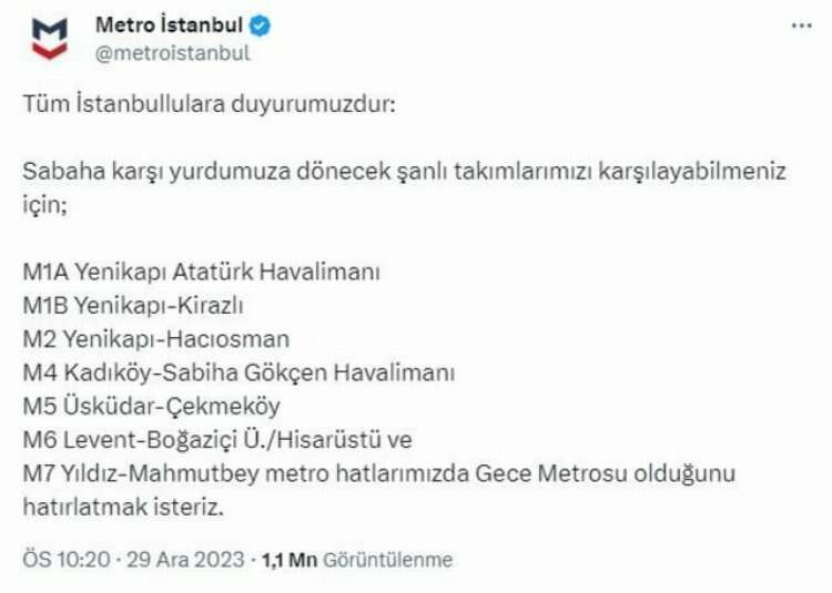 Yapılan açıklamada, "Sabaha karşı yurdumuza dönecek şanlı takımlarımızı karşılayabilmeniz için metro hatlarımızda Gece Metrosu olduğunu hatırlatmak isteriz." ifadeleri kullanıldı.