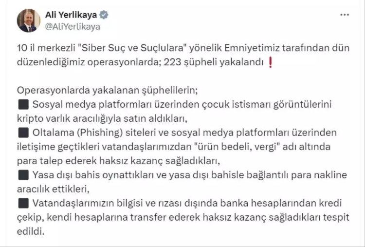 Bakan Yerlikaya, sosyal medya hesabından yaptığı açıklamada, cumhuriyet başsavcılıkları ile Emniyet Genel Müdürlüğü Siber Suçlarla Mücadele Daire Başkanlığı koordinesinde, dün siber suç ve suçlulara yönelik 10 il merkezli 31 ilde düzenlenen operasyonlarda 223 şüphelinin yakalandığını belirtti.