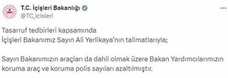 Açıklamada "Tasarruf tedbirleri kapsamında İçişleri Bakanımız Sayın Ali Yerlikaya’nın talimatlarıyla; Sayın Bakanımızın araçları da dahil olmak üzere Bakan Yardımcılarımızın koruma araç ve koruma polis sayıları azaltılmıştır." ifadeleri kullanıldı.
