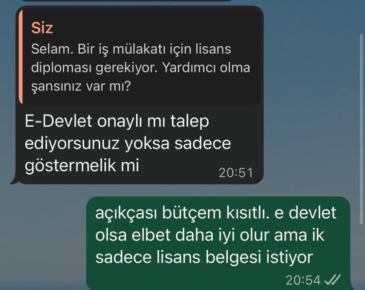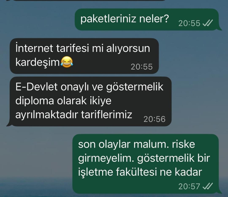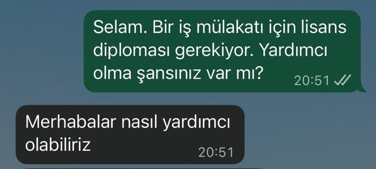 Onaylanan diplomalar, hizmeti (!) aldığından memnun olan vatandaşlar derken irtibata geçmek istedik. Tabii bu çok zor olmadı. Organik reçel satan sayfalardan daha hızlı bir dönüş aldık ve WhatsApp'e geçtik."