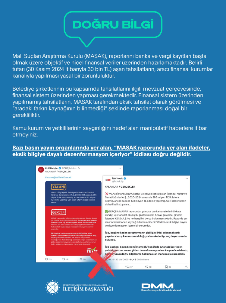 DMM'nin sosyal medya hesabından yapılan açıklamada, "Bazı basın yayın organlarında yer alan, 'MASAK raporunda yer alan ifadeler, eksik bilgiye dayalı dezenformasyon içeriyor' iddiası doğru değildir. MASAK, raporlarını banka ve vergi kayıtları başta olmak üzere objektif ve nicel finansal veriler üzerinden hazırlamaktadır. Belirli tutarı (30 Kasım 2024 itibarıyla 30 bin TL) aşan tahsilatların, aracı finansal kurumlar kanalıyla yapılması yasal bir zorunluluktur. Belediye şirketlerinin bu kapsamda tahsilatlarını ilgili mevzuat çerçevesinde, finansal sistem üzerinden yapması gerekmektedir. Finansal sistem üzerinden yapılmamış tahsilatların, MASAK tarafından eksik tahsilat olarak görülmesi ve aradaki farkın kaynağının bilinmediği şeklinde raporlanması doğal bir gerekliliktir. Kamu kurum ve yetkililerinin saygınlığını hedef alan manipülatif haberlere itibar etmeyiniz" denildi