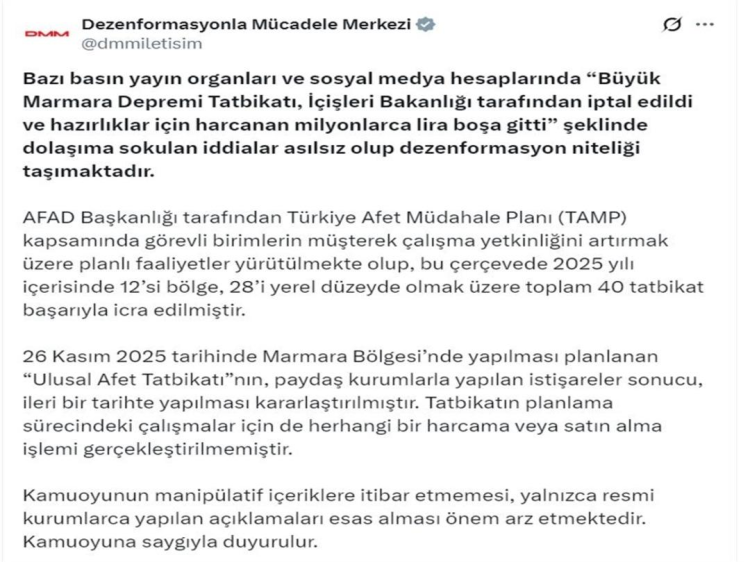 DMM'nin sosyal medya hesabından yapılan açıklamada, bazı basın yayın organları ve sosyal medya hesaplarında 'Büyük Marmara Depremi Tatbikatı, İçişleri Bakanlığı tarafından iptal edildi ve hazırlıklar için harcanan milyonlarca lira boşa gitti' şeklinde iddiaların dolaşıma sokulduğu belirtilerek, "İddialar asılsız olup dezenformasyon niteliği taşımaktadır. AFAD Başkanlığı tarafından Türkiye Afet Müdahale Planı (TAMP) kapsamında görevli birimlerin müşterek çalışma yetkinliğini artırmak üzere planlı faaliyetler yürütülmekte olup, bu çerçevede 2025 yılı içerisinde 12’si bölge, 28’i yerel düzeyde olmak üzere toplam 40 tatbikat başarıyla icra edilmiştir.