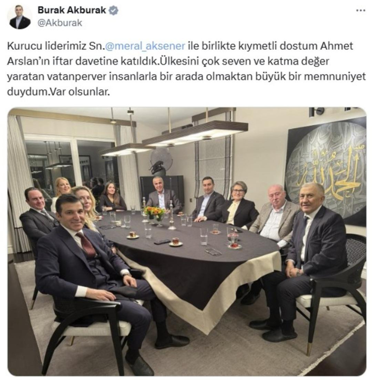 İmamoğlu'nun tutuklandığı ve görevden uzaklaştırıldığı gün ise Akşener, bir iftar yemeği organizasyonunda görüntülendi. Akşener'in de yer aldığı organizasyona ilişkin kare İYİ Parti İstanbul Milletvekili Burak Akburak tarafından sosyal medyada paylaşıldı. Akburak, paylaşımına, "Kurucu liderimiz Sn. Meral Akşener ile birlikte kıymetli dostum Ahmet Arslan'ın iftar davetine katıldık. Ülkesini çok seven ve katma değer yaratan vatanperver insanlarla bir arada olmaktan büyük bir memnuniyet duydum. Var olsunlar." notunu düştü.