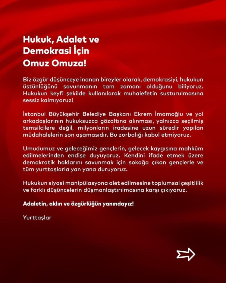 "Hukuk, adalet ve demokrasi için omuz omuza! Biz özgür düşünceye inanan bireyler olarak, demokrasiyi, hukukun üstünlüğünü savunmanın tam zamanı olduğunu biliyoruz. Hukukun keyfi şekilde kullanılarak muhalefetin susturulmasına sessiz kalmıyoruz!