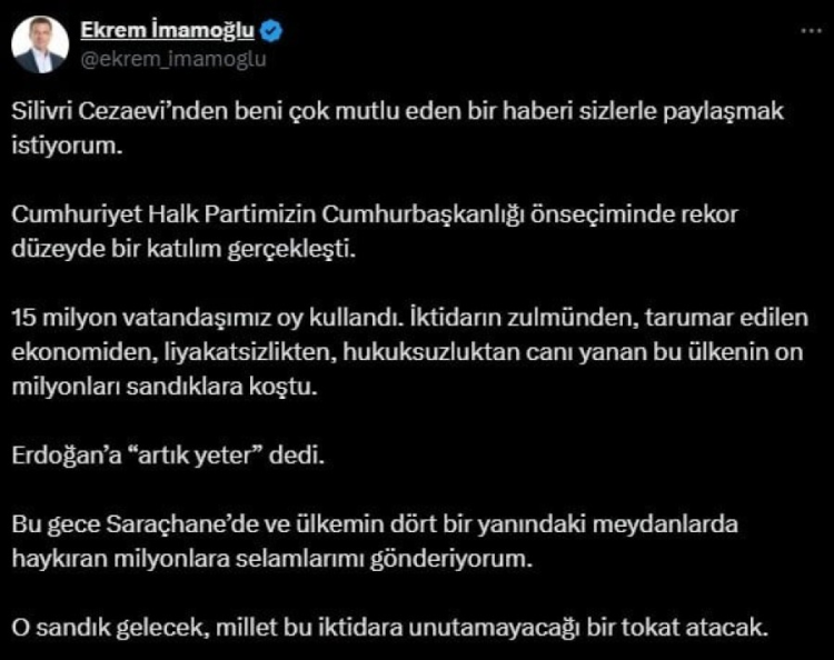 "Silivri Cezaevi'nden beni çok mutlu eden bir haberi sizlerle paylaşmak istiyorum. Cumhuriyet Halk Partimizin Cumhurbaşkanlığı önseçiminde rekor düzeyde bir katılım gerçekleşti. 15 milyon vatandaşımız oy kullandı. İktidarın zulmünden, tarumar edilen ekonomiden, liyakatsizlikten, hukuksuzluktan canı yanan bu ülkenin on milyonları sandıklara koştu. Erdoğan'a "artık yeter" dedi. Bu gece Saraçhane'de ve ülkemin dört bir yanındaki meydanlarda haykıran milyonlara selamlarımı gönderiyorum. O sandık gelecek, millet bu iktidara unutamayacağı bir tokat atacak."