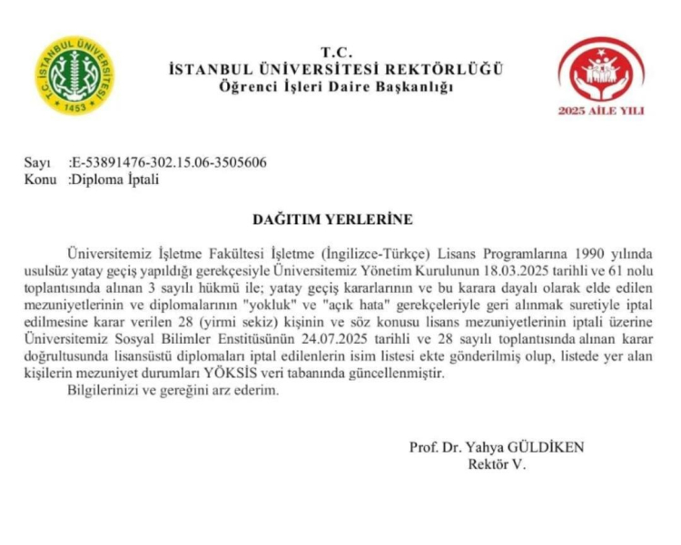 "Üniversitemiz İşletme Fakültesi İşletme (İngilizce-Türkçe) Lisans Programlarına 1990 yılında usulsüz yatay geçiş yapıldığı gerekçesiyle Üniversitemiz Yönetim Kurulunun 18.03.2025 tarihli ve 61 nolu toplantısında alınan 3 sayılı hükmü ile; yatay geçiş kararlarının ve bu karara dayalı olarak elde edilen mezuniyetlerinin ve diplomalarının "yokluk" ve "açık hata" gerekçeleriyle geri alınmak suretiyle iptal edilmesine karar verilen 28 (yirmi sekiz) kişinin ve söz konusu lisans mezuniyetlerinin iptali üzerine Üniversitemiz Sosyal Bilimler Enstitüsünün 24.07.2025 tarihli ve 28 sayılı toplantısında alınan karar doğrultusunda lisansüstü diplomaları iptal edilenlerin isim listesi ekte gönderilmiş olup, listede yer alan kişilerin mezuniyet durumları YÖKSİS veri tabanında güncellenmiştir. Bilgilerinizi ve gereğini arz ederim"