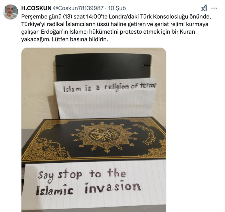 H.Coşkun isimli şahsın X üzerinden yaptığı paylaşımda, "Perşembe günü saat 14.00'te Londra'daki Türk Konsolosluğu önünde, Türkiye'yi radikal islamcıların üssü haline getiren ve şeriat rejimi kurmaya çalışan Erdoğan'ın İslamcı hükümetini protesto etmek için Kuran yakacağım. Lütfen basına bildirin." dediği görüldü.