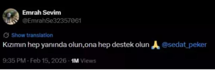 Sedat Peker'in etiketlendiği söz konusu paylaşımdaki mesajda, "Kızımın hep yanında olun, ona hep destek olun" ifadeleri yer aldı.
