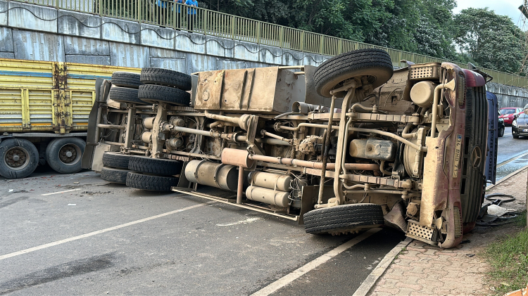 İstanbul Beykoz'da geri manevra yaptığı esnada kontrolden çıkan su tankeri kayarak park halindeki hafif ticari araca ve hafriyat kamyonunun dorsesine çarparak devrildi. Kazada tankerin sürücüsü yaralandı.