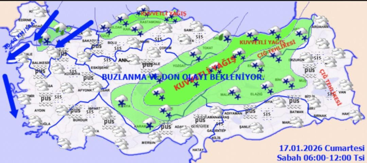 MGM; Artvin, Giresun, Gümüşhane, Kastamonu, Kayseri, Nevşehir, Rize, Sinop, Sivas, Trabzon, Yozgat ve Aksaray için sarı kodlu uyarı yayımladı. İç kesimlerde buzlanma ve don, Doğu Karadeniz ve Doğu Anadolu’nun yüksek kesimlerinde çığ tehlikesi sürüyor.