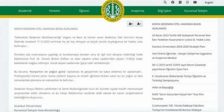 İstanbul Üniversitesi’nin “duyurular” sayfasında yayınlanan “Konya Dedeman Otel Hakkında Basın Açıklaması” başlığıyla yayınlanan metinde şu ifadeler yer aldı:
