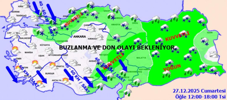 MGM'nin tahminlerine göre Hava sıcaklıkları kuzey, iç ve doğu kesimler başta olmak üzere Türkiye genelinde hissedilir derecede azalacak. MGM, bugün özellikle kuzey, iç ve doğu kesimler için buzlanma ve don uyarısı yaptı.