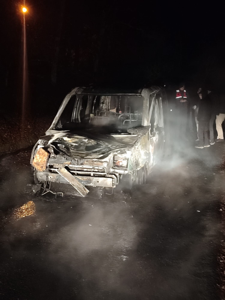Karabük'ün Yenice ilçesinde seyir halindeyken alev alan hafif ticari araç tamamen yanarak kullanılmaz hale geldi.