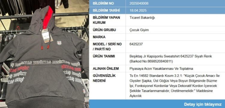 Ticaret Bakanlığı, çocuklara yönelik ürünlerde yürüttüğü denetimler kapsamında Beşiktaş Kulübü'nün resmi mağazası Kartal Yuvası'nda satılan bir çocuk sweatshirt'ünün güvenlik standartlarına uymadığını tespit etti. "Beşiktaş Jr Kapüşonlu Sweatshirt" isimli ürünün piyasadan toplatılmasına ve satışının durdurulmasına karar verildi.