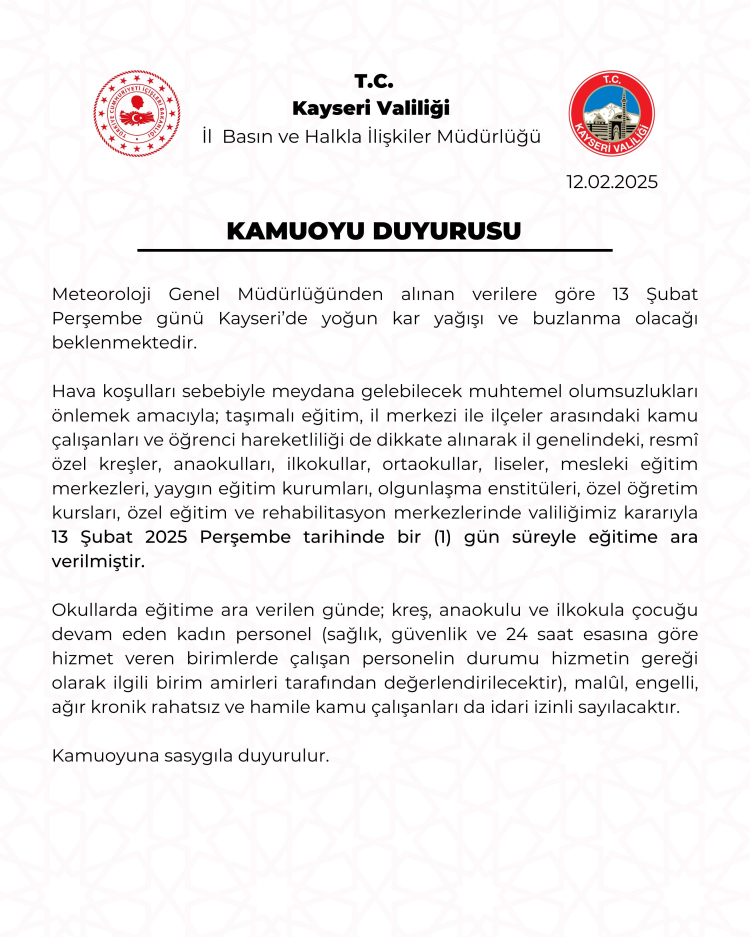 Kayseri Valiliği’nden yapılan açıklamada, "Meteoroloji Genel Müdürlüğünden alınan verilere göre 13 Şubat Perşembe günü Kayseri'de yoğun kar yağışı ve buzlanma olacağı beklenmektedir. Hava şartlarısebebiyle meydana gelebilecek muhtemel olumsuzlukları önlemek amacıyla; taşımalı eğitim, il merkezi ile ilçeler arasındaki kamu çalışanları ve öğrenci hareketliliği de dikkate alınarak il genelindeki, resmî özel kreşler, anaokulları, ilkokullar, ortaokullar, liseler, mesleki eğitim merkezleri, yaygın eğitim kurumları, olgunlaşma enstitüleri, özel öğretim kursları, özel eğitim ve rehabilitasyon merkezlerinde valiliğimiz kararıyla 13 Şubat 2025 Perşembe tarihinde 1 gün süreyle eğitime ara verilmiştir. Okullarda eğitime ara verilen günde; kreş, anaokulu ve ilkokula çocuğu devam eden kadın personel (sağlık, güvenlik ve 24 saat esasına göre hizmet veren birimlerde çalışan personelin durumu hizmetin gereği olarak ilgili birim amirleri tarafından değerlendirilecektir), malul, engelli, ağır kronik rahatsız ve hamile kamu çalışanları da idari izinli sayılacaktır. Kamuoyuna saygıyla duyurulur" ifadelerine yer verildi.