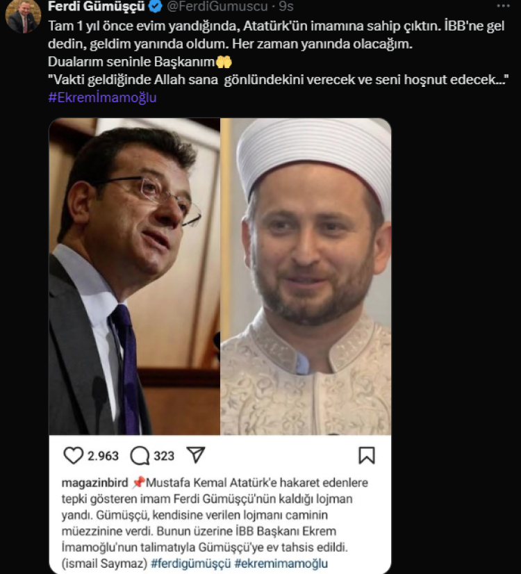 İstanbul Büyükşehir Belediye Başkanı Ekrem İmamoğlu’nun kendisine ev tahsis ettiği İmam Ferdi Gümüşçü, sosyal medyada yayınladığı mesajla başkana dua ve desteklerini iletti.