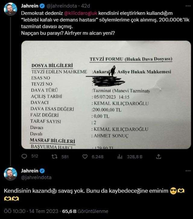 CHP Genel Başkanı Kemal Kılıçdaroğlu, kendisine yönelik söylemleri nedeniyle sosyal medyada 'Jahrein' olarak tanınan fenomen Ahmet Sonuç'a 200 bin TL'lik tazminat davası açtı. Gelişmeyi Jahrein kişisel Twitter hesabından duyurdu.