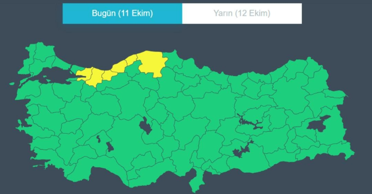 Sarı kodlu uyarı verilen iller arasında Kocaeli, Sakarya, Düzce, Zonguldak, Sakarya ve Bartın illeri yer aldı.
