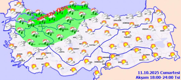 Meteoroloji Genel Müdürlüğü tarafından yapılan tahminlere göre ülkemizin kuzey, iç ve batı kesimlerinin parçalı, yer yer çok bulutlu, Marmara (Çanakkale hariç), İç Anadolu'nun kuzeybatısı, Batı ve Orta Karadeniz, Doğu Karadeniz kıyuıları ile Kütahya, Uşak, Afyonkarahisar, Konya, Aksaray, Kırşehir, Yozgat ve Artvin çevrelerinin yağmur ve sağanak yağışlı, yer yer gök gürültülü sağanak yağışlı, diğer yerlerin az bulutlu ve açık geçeceği tahmin ediliyor.