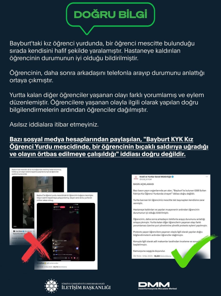 Cumhurbaşkanlığı İletişim Başkanlığı Dezenformasyonla Mücadele Merkezi (DMM), "Bayburt KYK Kız Öğrenci Yurdu mescidinde, bir öğrencinin bıçaklı saldırıya uğradığı ve olayın örtbas edilmeye çalışıldığı" iddiasının gerçeği yansıtmadığını bildirdi.