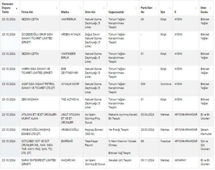 Tarım ve Orman Bakanlığı'nın yayımladığı listede bu sefer ağırlıklı olarak yağ markaları vardı. Bazı markaların zeytinyağına tohum yağı kattığı tespit edilirken aynı zaman da haşhaşın içinden de yer fıstığı bulundu.