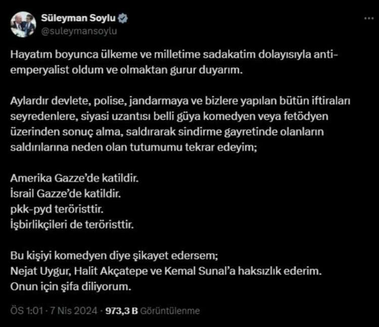 "Hayatım boyunca ülkeme ve milletime sadakatim dolayısıyla anti-emperyalist oldum ve olmaktan gurur duyarım. Aylardır devlete, polise, jandarmaya ve bizlere yapılan bütün iftiraları seyredenlere, siyasi uzantısı belli güya komedyen veya fetödyen üzerinden sonuç alma, saldırarak sindirme gayretinde olanların saldırılarına neden olan tutumumu tekrar edeyim; Amerika Gazze’de katildir. İsrail Gazze’de katildir. pkk-pyd teröristtir. İşbirlikçileri de teröristtir. Bu kişiyi komedyen diye şikayet edersem; Nejat Uygur, Halit Akçatepe ve Kemal Sunal’a haksızlık ederim. Onun için şifa diliyorum."