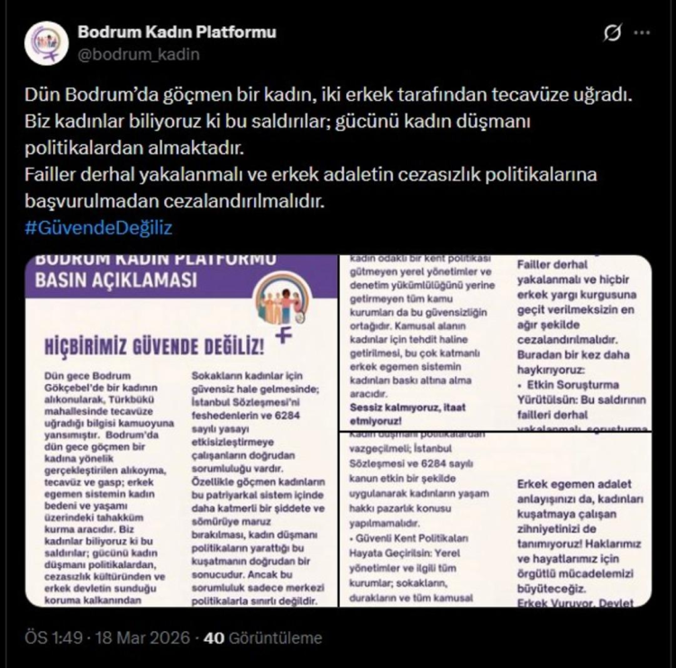 Yapılan açıklamada, "Dün Bodrum’da göçmen bir kadın, iki erkek tarafından tecavüze uğradı. Biz kadınlar biliyoruz ki bu saldırılar; gücünü kadın düşmanı politikalardan almaktadır.