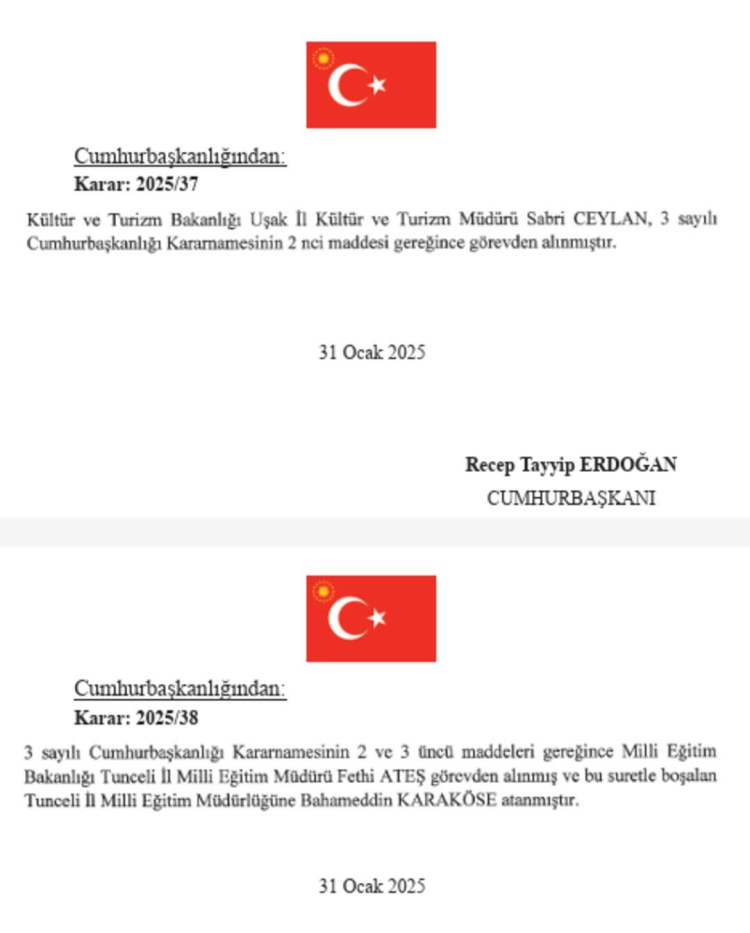 Cumhurbaşkanı Recep Tayyip Erdoğan, Kültür ve Turizm Bakanlığı Uşak Kültür ve Turizm Müdürü Sabri Ceylan'ı görevden aldı. Resmi Gazete'de yayımlanan karara göre Milli Eğitim Bakanlığı Tunceli İl Milli Eğitim Müdürü Fethi Ateş de görevden alındı.