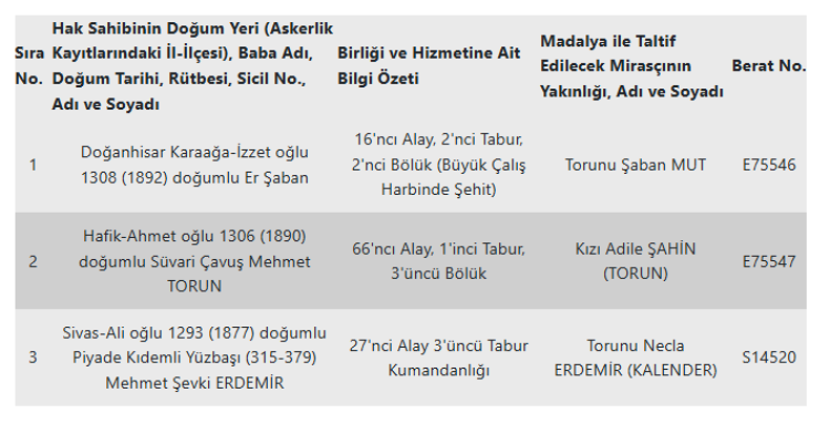 Kararın ekinde yer alan listeye göre, İstiklal Madalyası almaya hak kazanan gaziler ile mirasçıların isimleri şöyle: