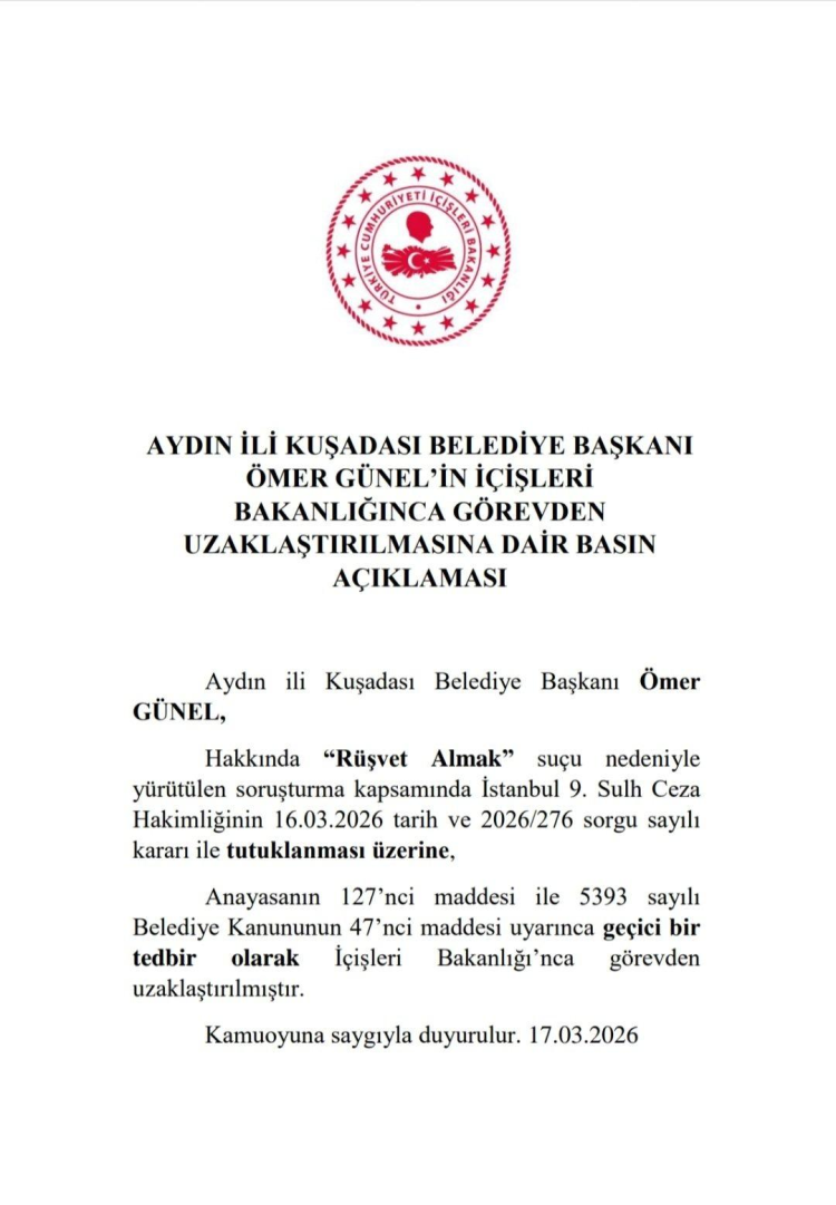 İstanbul Cumhuriyet Başsavcılığınca yürütülen "rüşvet" ve "irtikap" suçlarına ilişkin soruşturma kapsamında gözaltına alınan 6 şüpheliden aralarında Kuşadası Belediye Başkanı Ömer Günel'in de bulunduğu 5'i dün tutuklanmıştı. İçişleri Bakanlığı, Günel'in görevden uzaklaştırıldığını açıkladı.
