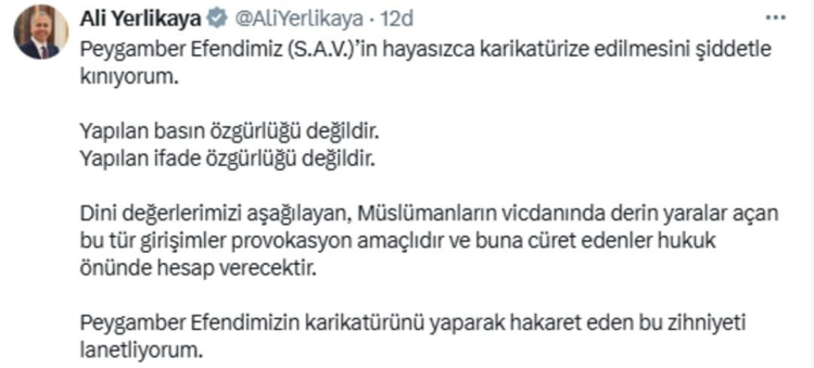 "Peygamber Efendimiz (S.A.V.)’in hayasızca karikatürize edilmesini şiddetle kınıyorum.