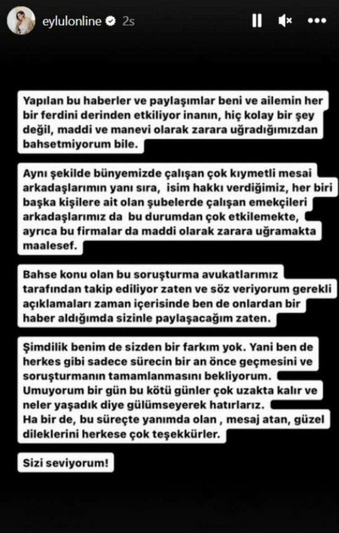 Bahse konu olan bu soruşturma avukatlarımız tarafından takip ediliyor zaten ve söz veriyorum gerekli açıklamaları zaman içerisinde ben de onlardan bir haber aldığımda sizinle paylaşacağım zaten. Şimdilik benim de sizden bir farkım yok. Yani ben de herkes gibi sadece sürecin bir an önce geçmesini ve soruşturmanın tamamlanmasını bekliyorum. Umuyorum bir gün bu kötü günler çok uzakta kalır ve neler yaşadık diye gülümseyerek hatırlarız. Ha bir de, bu süreçte yanımda olan, mesaj atan, güzel dileklerini herkese çok teşekkürler. Sizi seviyorum!"