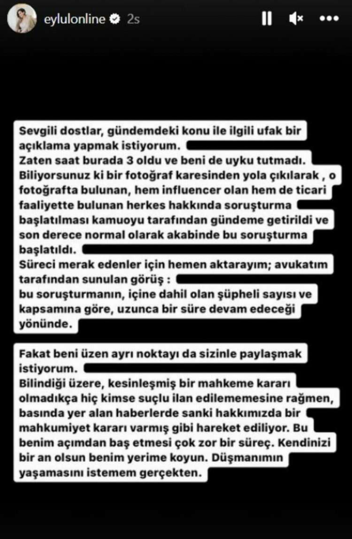 "Sevgili dostlar, gündemdeki konu ile ilgili ufak bir açıklama yapmak istiyorum. Zaten saat burada 3 oldu ve beni de uyku tutmadı. Biliyorsunuz ki bir fotoğraf karesinden yola çıkılarak o fotoğrafta bulunan hem influencer olan hem de ticari faaliyette bulunan herkes hakkında soruşturma başlatılması kamuoyu tarafından gündeme getirildi ve son derece normal olarak akabinde bu soruşturma başlatıldı. Süreci merak edenler için hemen aktarayım; avukatım tarafından sunulan görüş, bu soruşturmanın, içine dahil olan şüpheli sayısı ve kapsamına göre, uzunca bir süre devam edeceği yönünde.