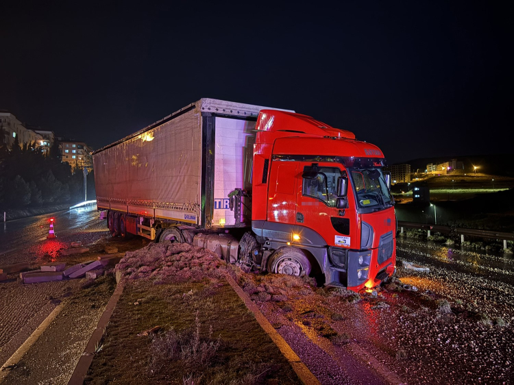 Kaza, saat 19.00 sıralarında İzmir-Ankara D300 karayolu Kavacık Rampaları'nda meydana geldi. Edinilen bilgilere göre, Mahsun Ç. idaresindeki 33 AYY 788 plakalı tır, yağışlı havanın da etkisiyle kayganlaşan yolda kontrolden çıkarak refüje çıktı. Çarpmanın etkisiyle refüjde bulunan taşların yola savrulması sonucu aynı yönde seyir halinde olan Hurşut A. idaresindeki 06 LRY 60 plakalı otomobil ile Hakan Ş. yönetimindeki 35 BZT 252 plakalı otomobilde hasar oluştu. Kazada şans eseri yaralanan olmazken, ihbar üzerine olay yerine çok sayıda polis ekibi sevk edildi.
