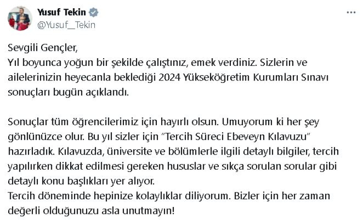 Milli Eğitim Bakanı Yusuf Tekin, tercih kılavuzuna ilişkin sosyal medya hesabından yaptığı açıklamada, "Sevgili gençler, yıl boyunca yoğun bir şekilde çalıştınız, emek verdiniz. Sizlerin ve ailelerinizin heyecanla beklediği 2024-YKS sonuçları bugün açıklandı. Sonuçlar tüm öğrencilerimiz için hayırlı olsun. Umuyorum ki her şey gönlünüzce olur. Bu yıl sizler için 'Tercih Süreci Ebeveyn Kılavuzu' hazırladık. Kılavuzda, üniversite ve bölümlerle ilgili detaylı bilgiler, tercih yapılırken dikkat edilmesi gereken hususlar ve sıkça sorulan sorular gibi detaylı konu başlıkları yer alıyor. Tercih döneminde hepinize kolaylıklar diliyorum. Bizler için her zaman değerli olduğunuzu asla unutmayın" dedi.